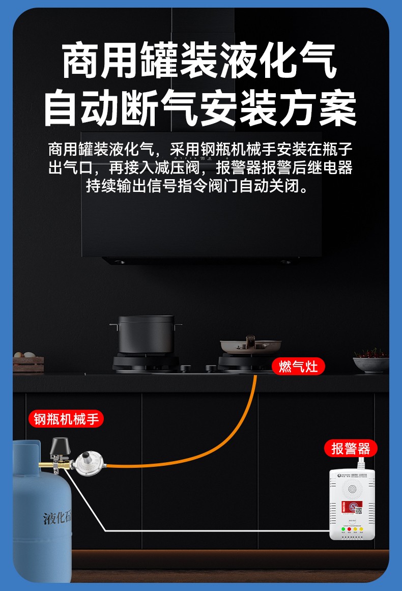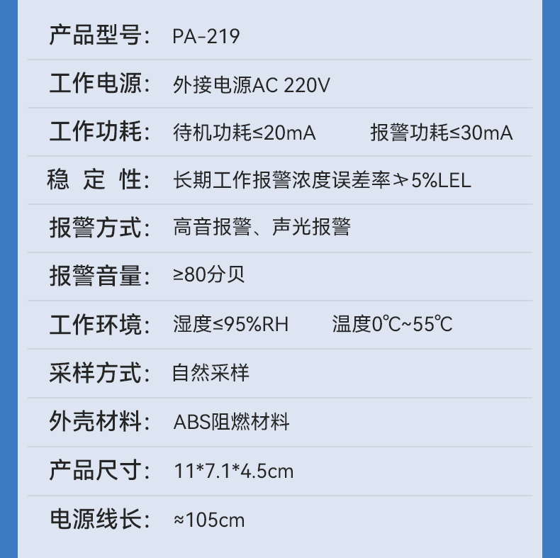 燃氣報警器 (型號PA-219) 產品規格 功能特點 資料下載 燃氣報警器 (型號PA-219)1、多種氣體檢測2、90分貝高音報警3、探測靈敏4、故障質檢5、聯動切斷燃氣6、中國平安保險7. 可連接機械手閥適用場景:適用于家庭廚房、酒店廚房、食堂、商場等場所
