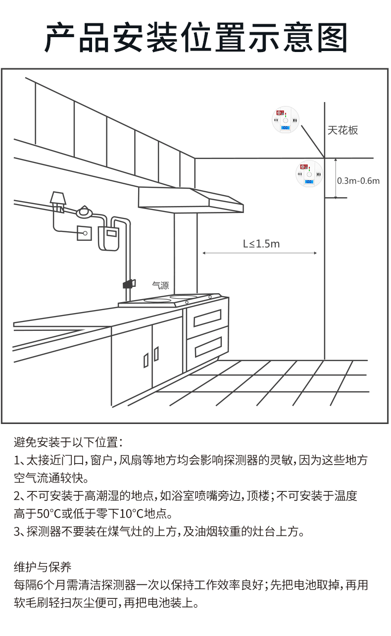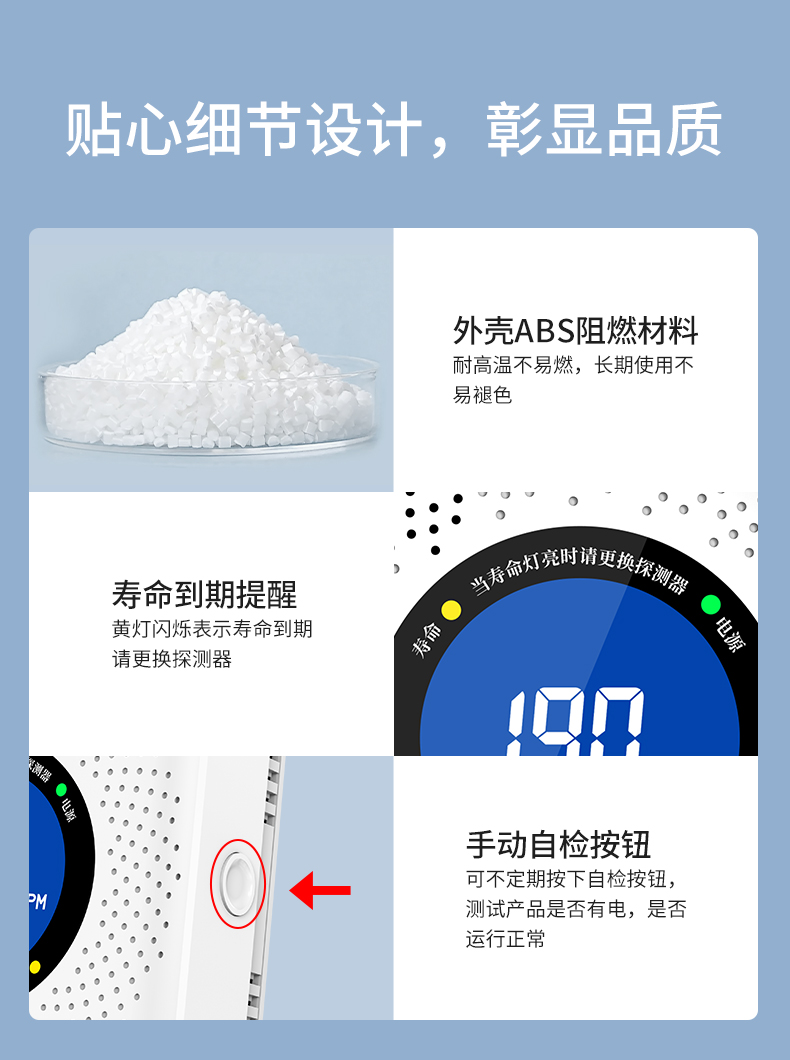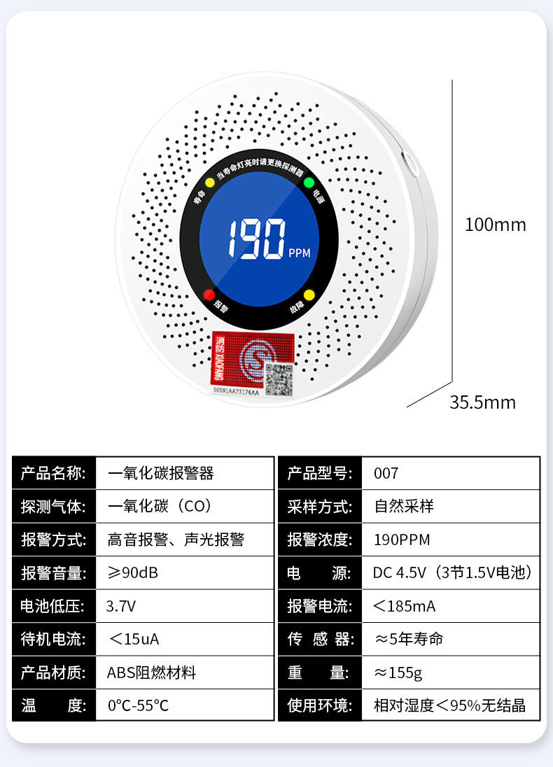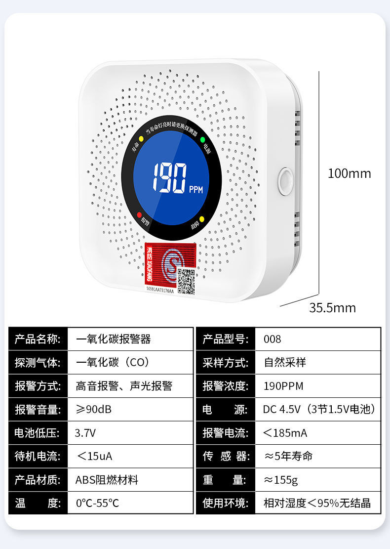 一氧化碳報警器(型號PA-009) 產品規格 功能特點 資料下載 一氧化碳報警器(型號PA-009)1.檢測氣體、燒煤、燒柴、燒炭、蜂窩媒、露營封閉環境、封閉車內2.85分貝報警音量3..LED液晶屏幕顯示4.故障自檢: 綠燈(正常)、黃燈 (故障、需要檢修) 紅燈(氣體濃度超標)5.報警方式:蜂鳴聲提示 6. 產品保險:1000萬承險7. ABS阻燃材質適用場景:適用于廚房、浴室、起居室、火鍋包廂、飯堂等長時間空氣不流通的場所安裝一氧化碳報警探測器